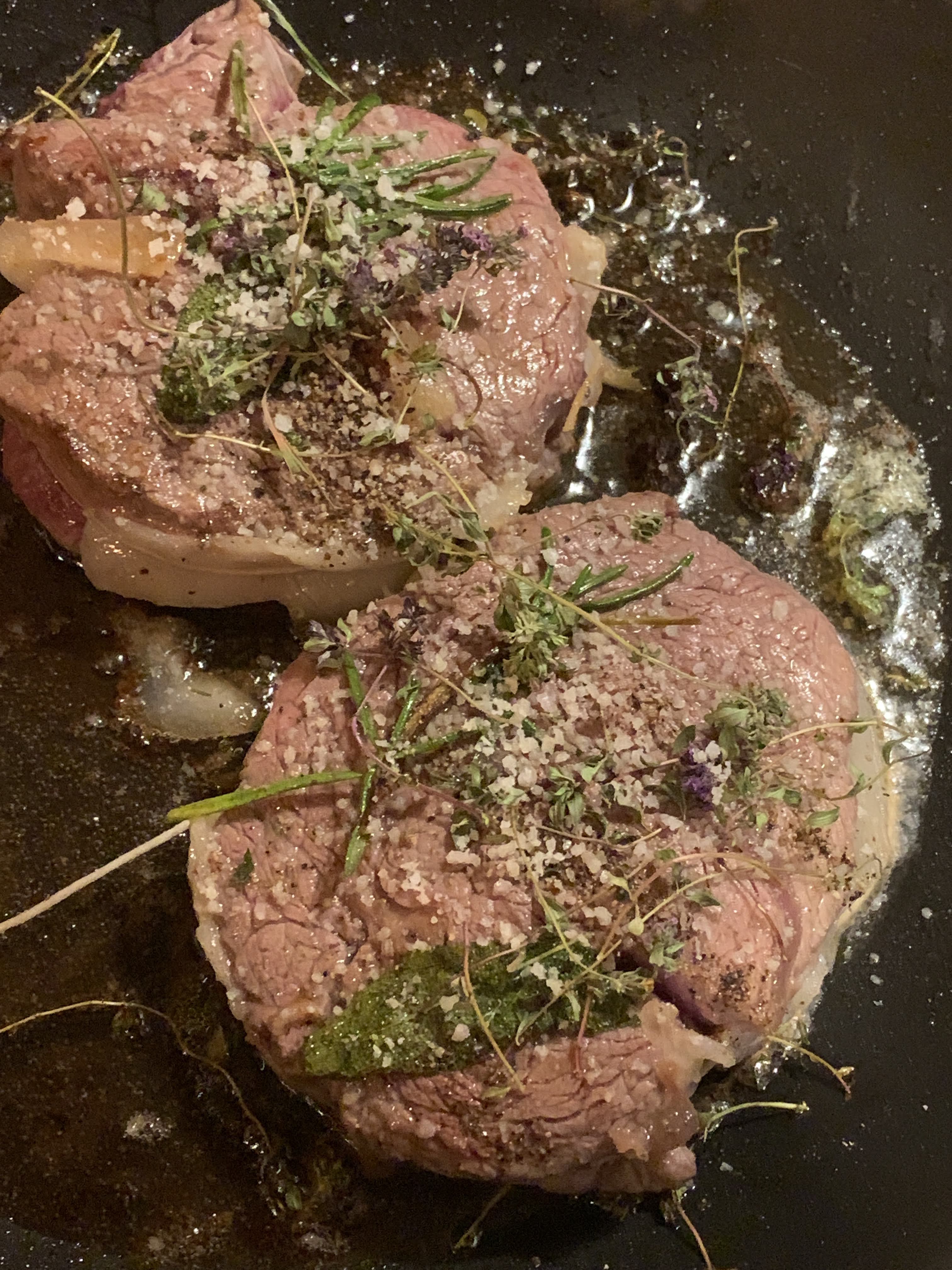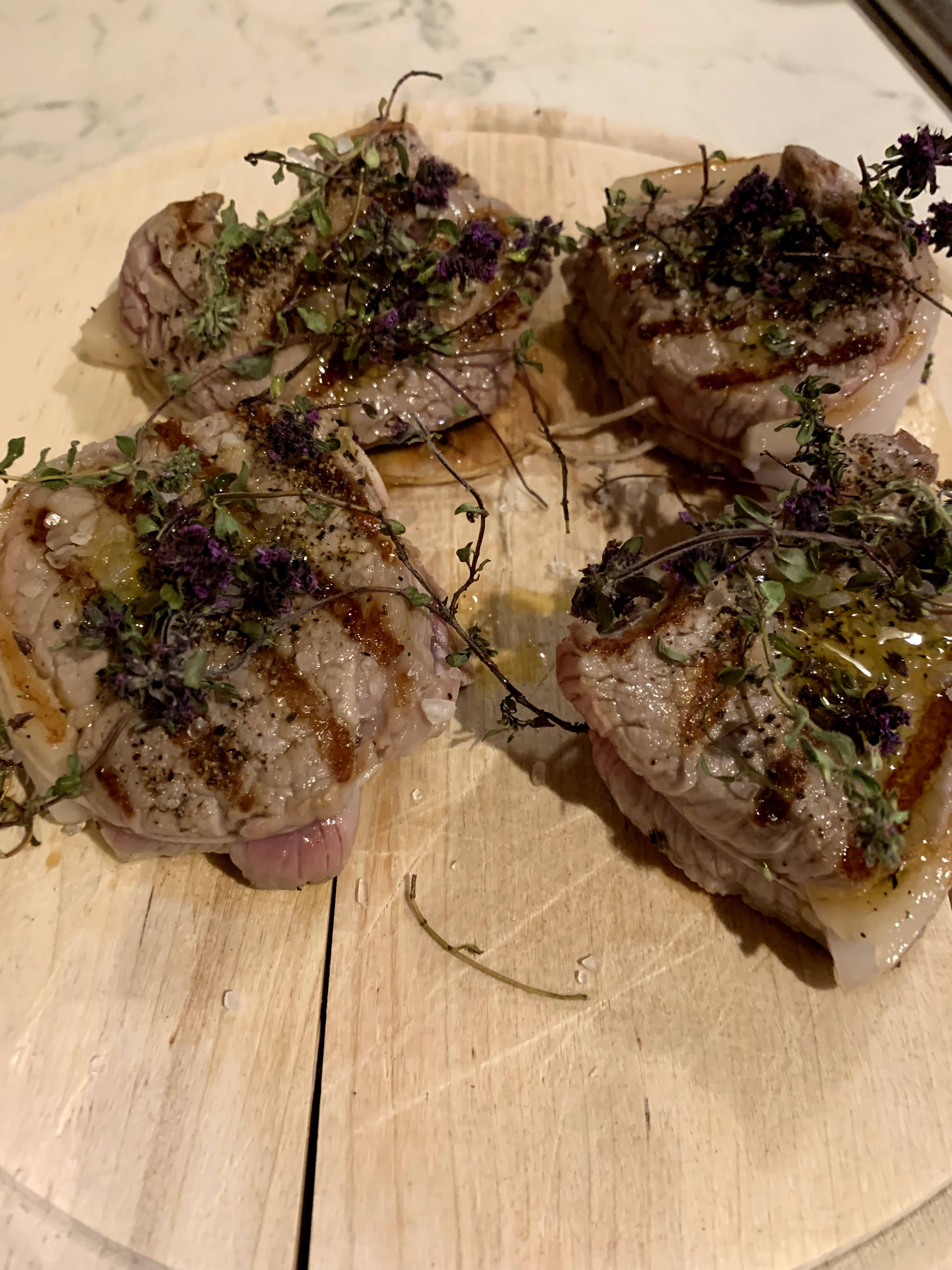 cuocere ai ferri su piastra oppure su padella antiaderente appena unta, a scelta. Sul fondo diverse bacche di ginepro per profumare.(Se non verranno aggiunti i funghi, aggiungere anche rosmarino e salvia)A parte friggere da ambedue i lati in padella le cappelle dei funghi su un fondo di olio EVO, prezzemolo, aglio. Ci vogliono ca. 15' perché siano ben cotte.Quando i medaglioni sono quasi cotti (molto al sangue), aggiungere rametti di timo e sale grosso di qualità, pepare. Spegnere subito e ricoprire con le cappelle e * .Come contorno si possono aggiungere i funghi restanti, saltati in padella con poco olio EVO e aglio e prezzemolo.(Versione senza porcini, ai ferri)Vino Chianti classico.
