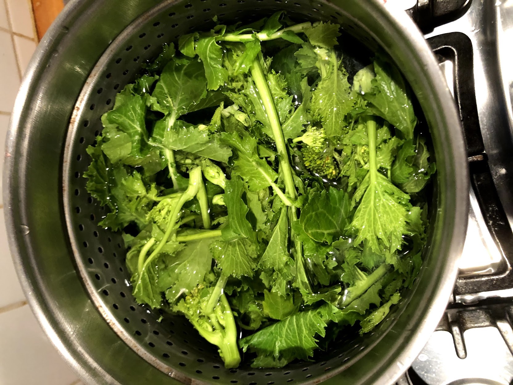 Delle cime di rapa avrete eliminato le foglie più coriacee e i gambi troppo lunghi e legnosi. Lessare in abbondante acqua fredda salata.