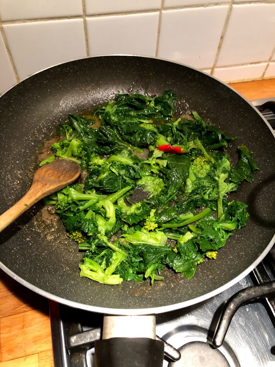 Quando le alici si saranno sciolte aggiungere le cime di rapa ben scolate e tagliate grossolanamente. Pestarle un poco con la forchetta e scaltrire leggermente.