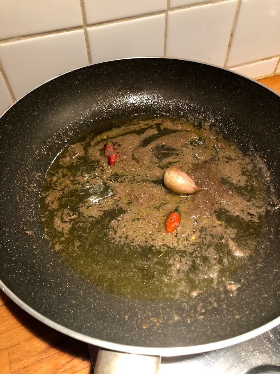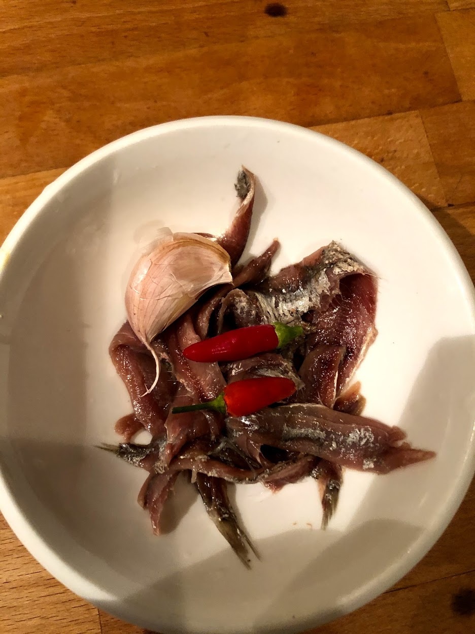 In un ampio tegame riscaldare l'aglio con i peperoncini (opzionale) e le alici pulite da sale e lische e lavateli. Molto lentamente, non deve assolutamente friggere.