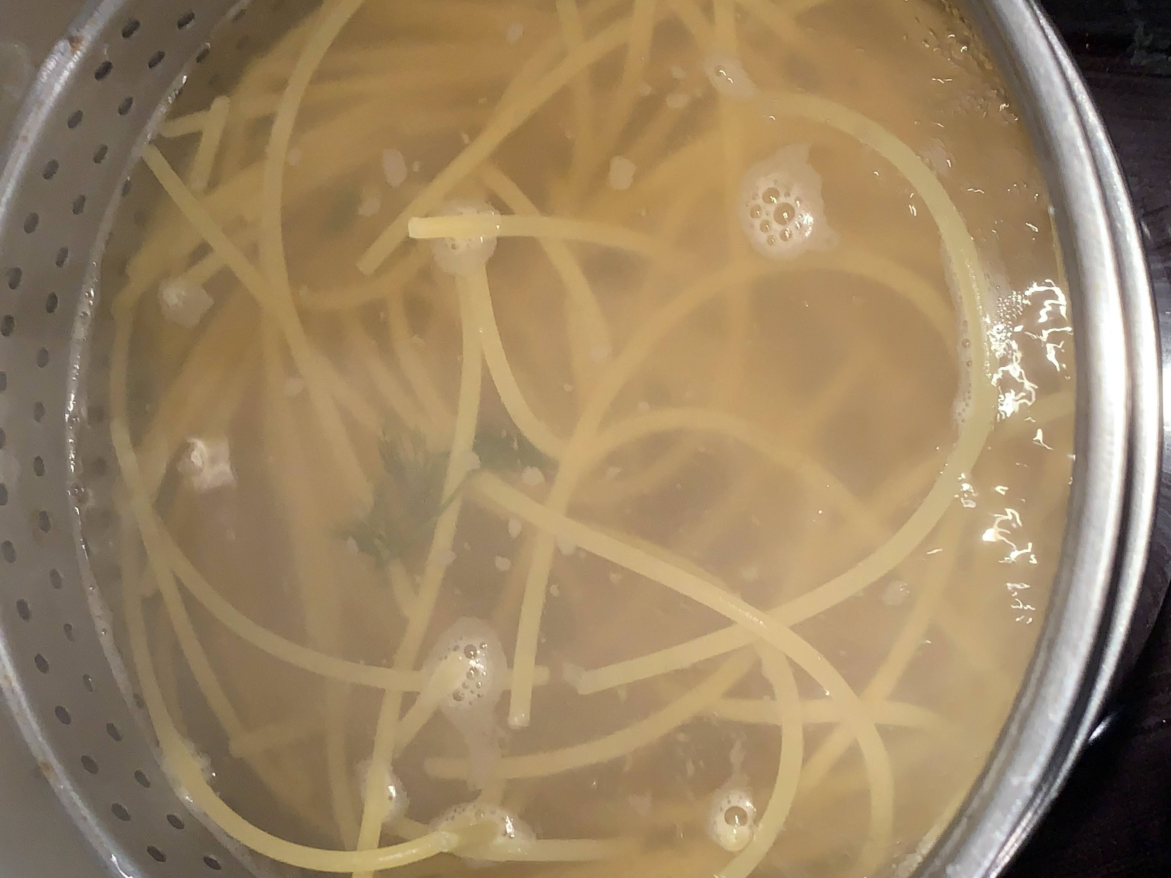 Fate lessare i bucatini nella restante acqua dei finocchietti. Scolateli al dente.
