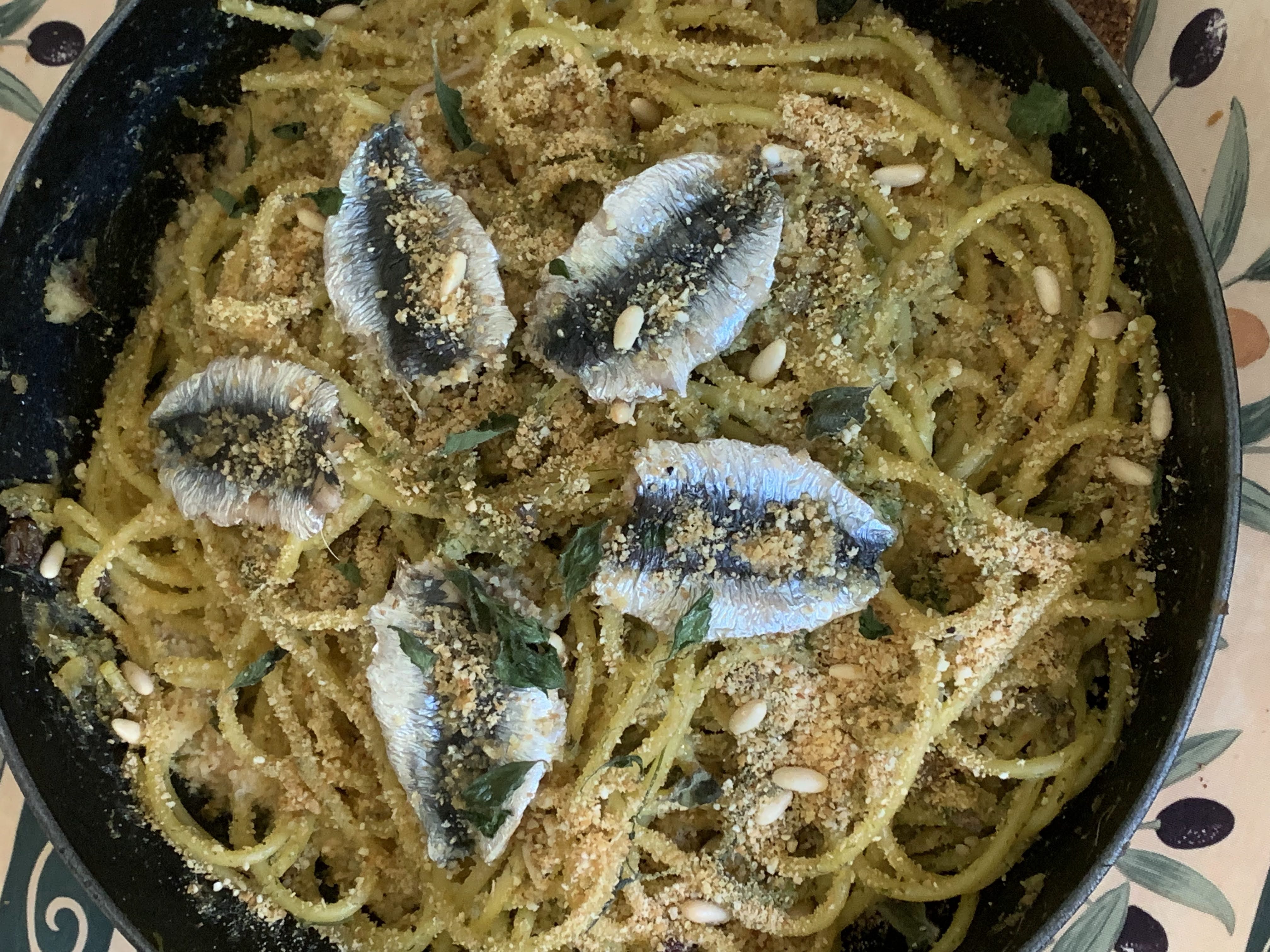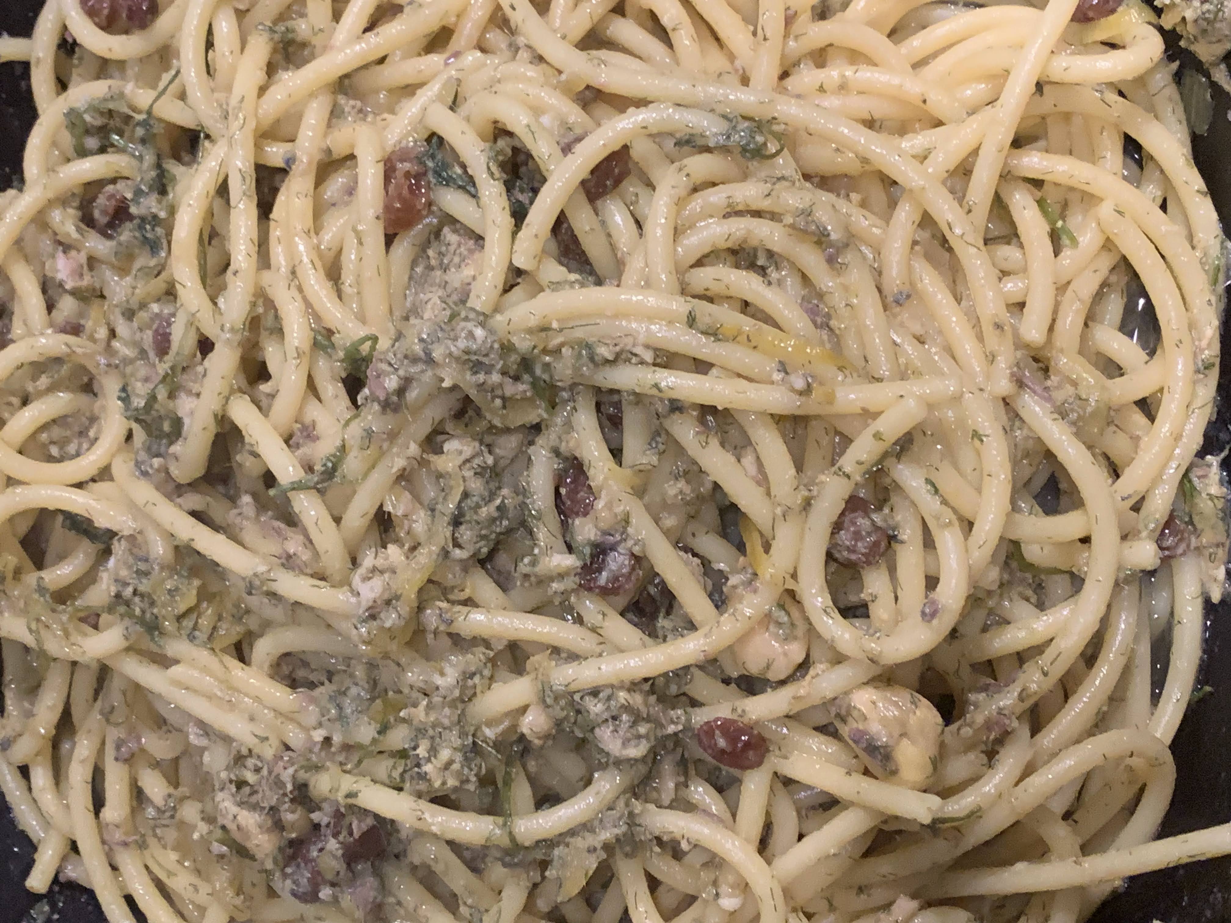 500 gr.di bucatini 700 gr. di sarde deliscate private della testa e delle interiora 3 mazzi di finocchiettoun cucchiaio di estratto di pomodorouna cipolla 4 acciughe salate pulite e deliscate un cucchiaio di pinoliun cucchiaio di uva passa zafferano puro a filiolio extravergine di oliva sale pepe quanto basta 1/2 bicchiere di vino bianco.