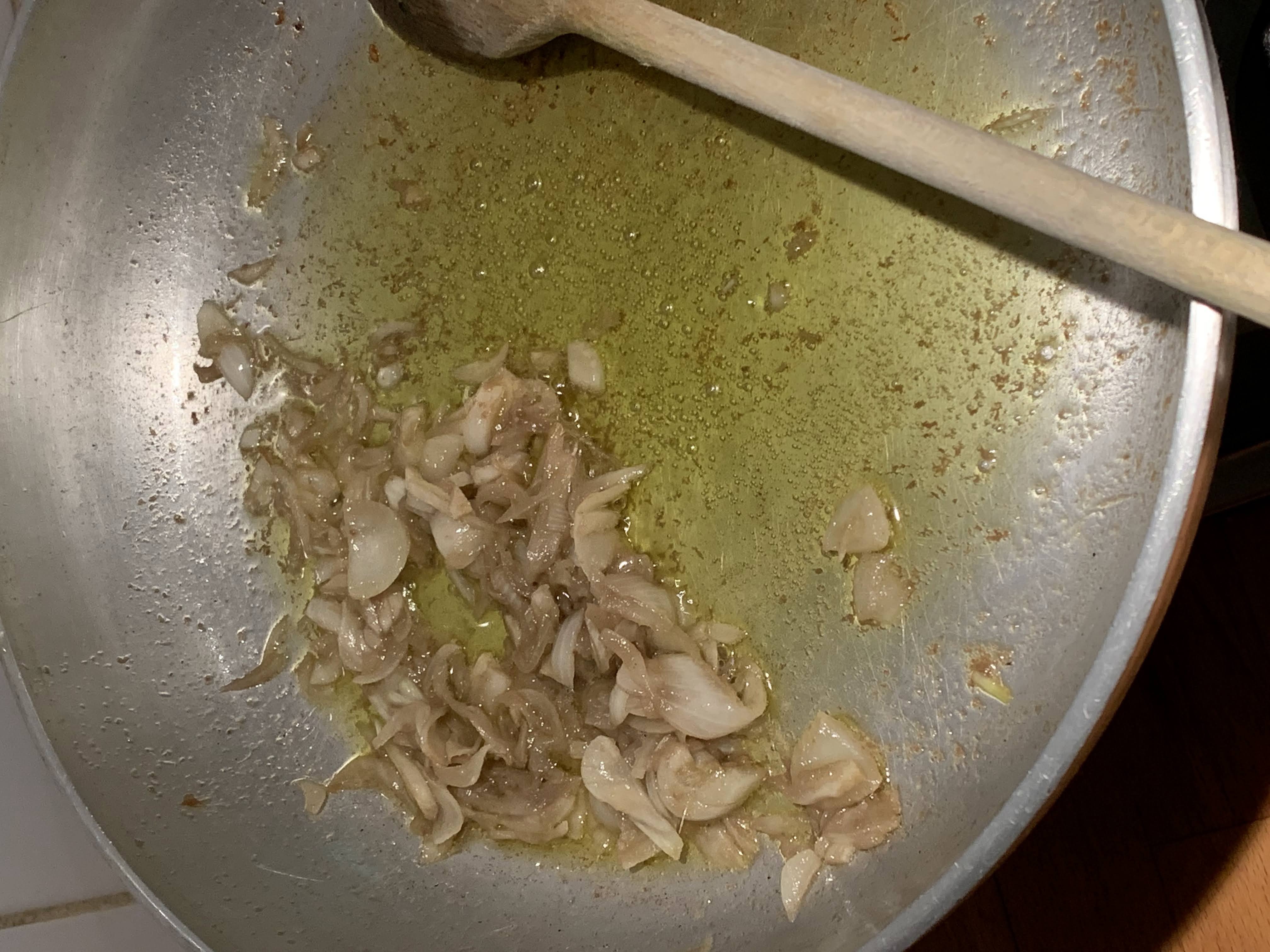 Scolatelo e mettete da parte l’acqua di bollitura, quindi tritatelo grossolanamente e soffrigetelo con poco olio. A parte fate dorare, a fuoco lento, la cipolla tritata finemente.