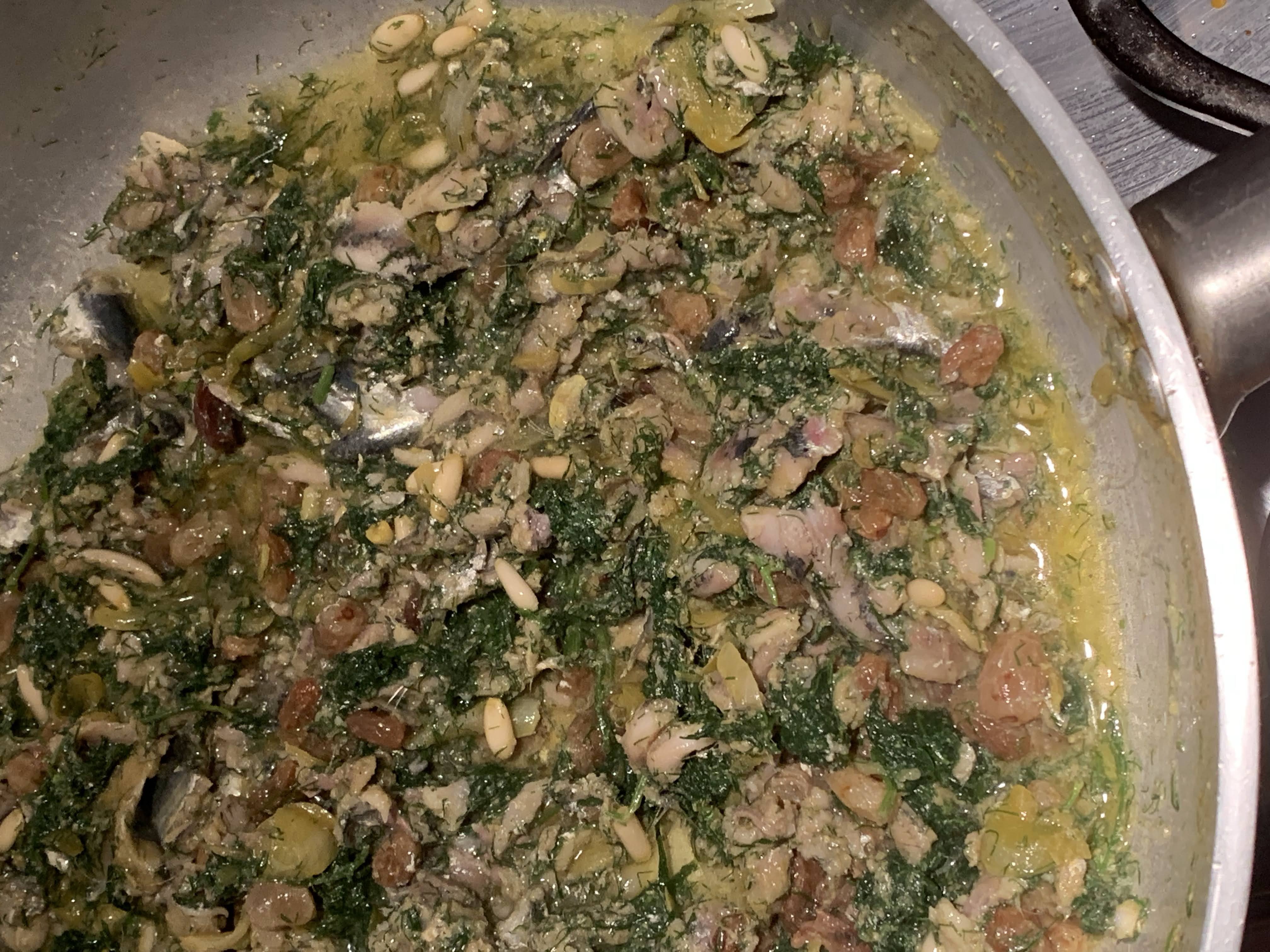 Aggiungete le alici lavate e diliscate e l’estratto di pomodoro, sciolto con 1/2 bicchiere di acqua e 1/2 di vino bianco. Lavorate il composto con una spatola di legno affinché si trasformi in una crema. Unite una metà delle sarde deliscate, il fìnocchietto, l’uva passa con i pinoli e lo zafferano e fate cuocere a fuoco lento per circa mezz’ora.