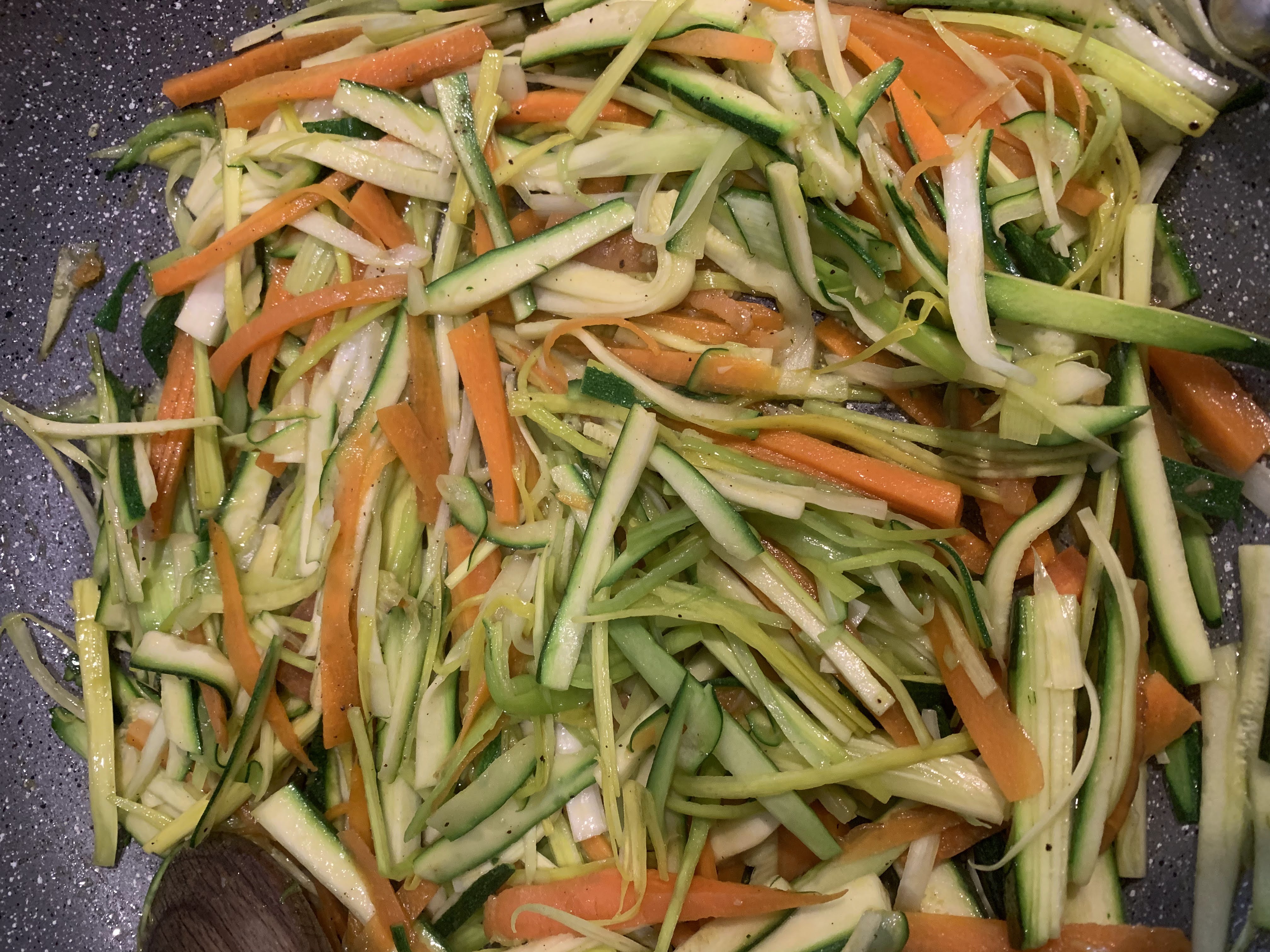 Tagliare a striscioline sottili lunghe ca 3 cm. le verdure. Fare soffriggere con uno spicchio d'aglio in poco olio su fiamma viva finché mantengono consistenza. Sgusciare le mazzancolle e fare soffriggere su fiamma viva con uno spicchio d'aglio e una manciatina di zafferano integro.